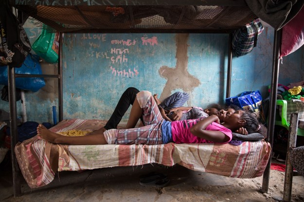 Girls chat in a dormitory for unaccompanied minors in Shagarab camp. Tens of thousands of refugees live across the camps, after escaping mandatory, unending military service and repression in their home country. Young females are more at risk of kidnapping and sexual exploitation, meaning smugglers will charge them more if they want to leave the camps.