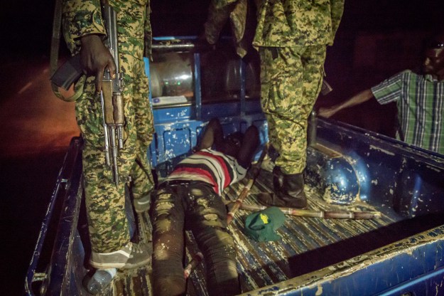 Soldiers stand over a man they found outside during curfew hours amid coronavirus crisis in Gulu, northern Uganda. Uganda’s coronavirus-related curfew meant citizens had to be at home between 7pm and 6.30am.