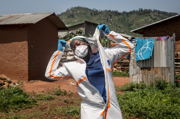 World Health Organization worker Belinda Landu, 28, changes her protective outfit after decontaminating the house of a pastor who has just tested positive for Ebola in Beni.