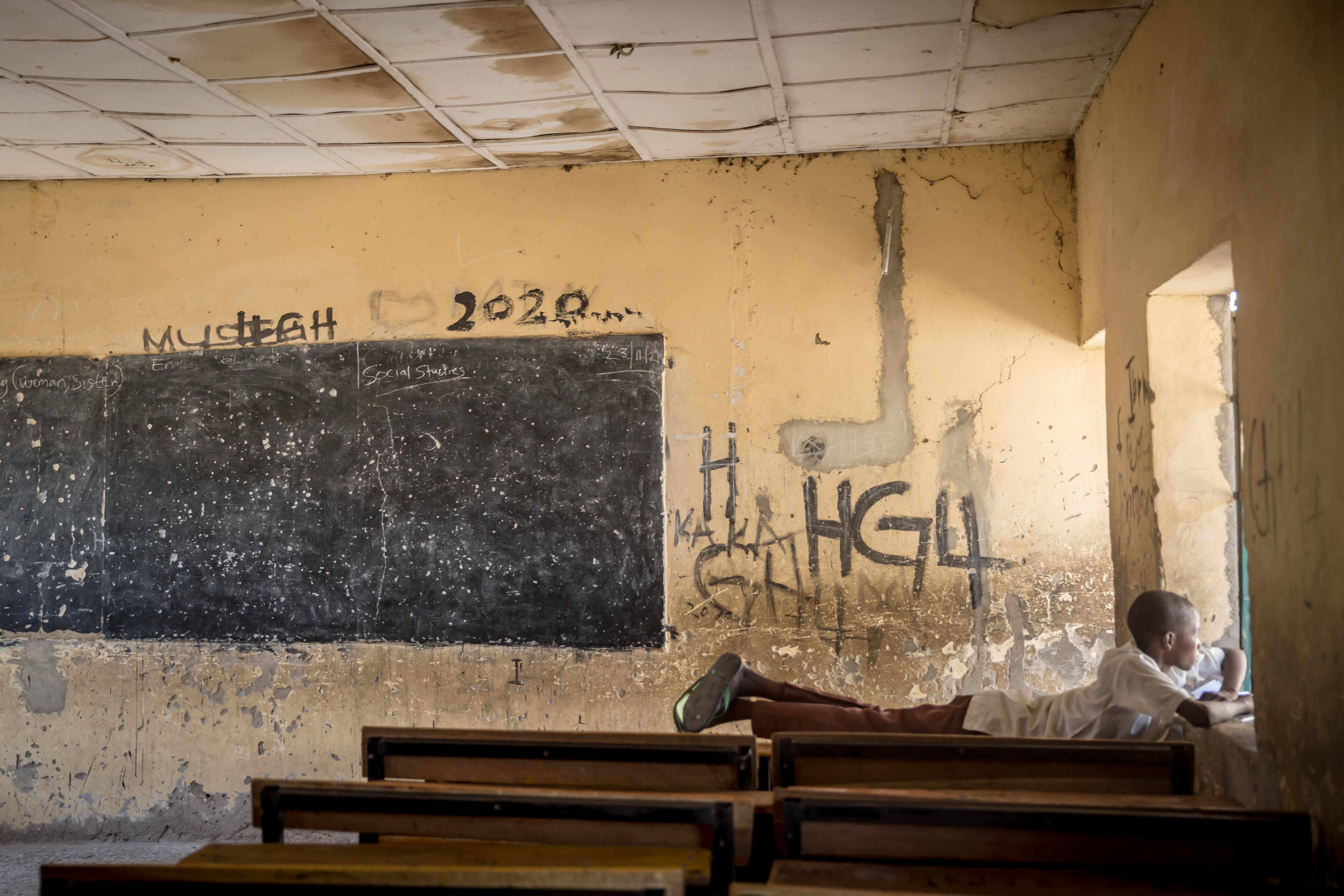 A boy seen laying on a desk in an empty classroom of aMaiduguri primary school.