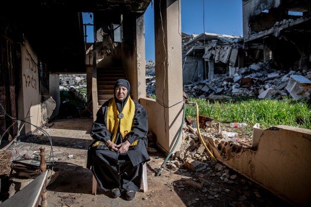 Anisa sits in her partially destroyed home on the day her son is buried in a mass funeral.